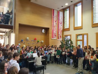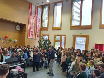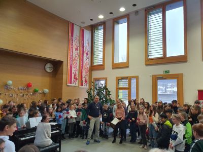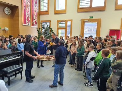 Kurz vor der Pause hieß es „absolute Ruhe“, als alle Schülerinnen und Schüler der Staatlichen Realschule Schöllnach in der Aula zu einer kleinen Überraschung für ihren Schulleiter, Herrn Graf, zum 50. Geburtstag zusammenkamen. Als er dann hereingeführt wurde, sangen die Klassen 5a und 5b unter der Federführung von Frau Faigl (die an dem selben Tag Geburtstag hatte) ein eigens gedichtetes Lied für ihn. Hier nur ein kleiner Auszug: