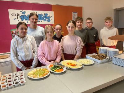 Die Mitglieder des Schülercafés haben den Schülerinnen und Schülern der 5. Klassen ein leckeres und gesundes Frühstück vorbereitet. Diese ließen sich, begeistert von der etwas anderen Unterrichtsstunde, das frische Bauernbrot, den Käse, Gemüsesticks oder das selbstgemachte Müsli schmecken.