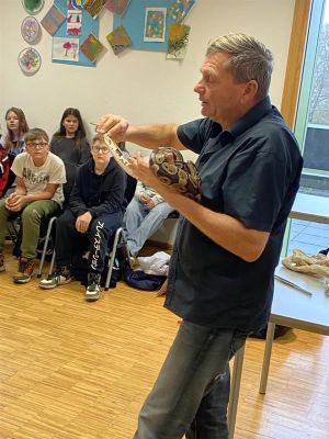 Wie schon in den vergangenen Jahren besuchte der Reptilienexperte Manfred Werdan die sechsten Klassen der Realschule Schöllnach. Im Gepäck hatte er neben einheimischen Reptilien wie etwa Ringelnatter, Kreuzotter oder Äskulapnatter auch exotische Tiere, darunter junge Axolotl, Korallennatter, Tigerpython, Chamäleon und Babyschildkröten. Er bewies eindrucksvoll, dass diese Tiere keineswegs „eklig“ oder „furchterregend“, sondern vielmehr faszinierend und auch schutzbedürftig sind.