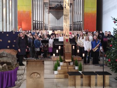 Beide Adventsgottesdienste wurden gemeinsam von Schulchor, Bläsergruppe, Lehrerchor und den Klassen 5c und 6d musikalisch mit einem bunten, abwechslungsreichen Programm unter der Leitung von Frau Faigl und Herrn Eckmüller mitgestaltet. Zusammen mit Schülern hatten Frau Spandel und Frau Heinzl einen besinnlichen Wortgottesdienst vorbereitet. Herzlichen Dank auch an das Technikerteam mit Herrn Wötzel und Herrn Fürstberger an der Kirchenorgel.