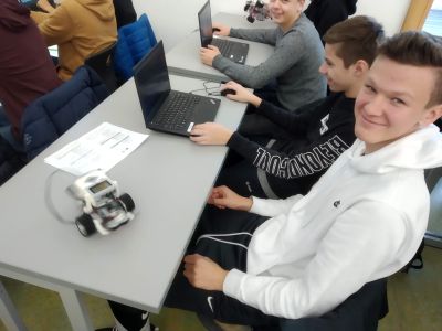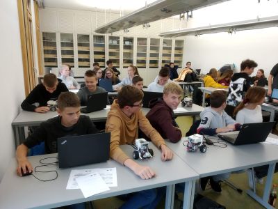Mit Laptops und programmierbaren Robotern im Gepäck besuchten Vertreter der Technischen Hochschule Deggendorf am 13.11.2019 die Klassen 9 a und 9 d. Nach einem Überblick zum Thema "Informatik und Robotik im Alltag" ging es dann auch gleich ans Programmieren. Die Schülerinnen und Schüler durften dabei eigene textbasierte Programme umsetzen und diese an den Robotern anhand praktischer Aufgaben ausprobieren. Es galt dabei zum Beispiel einen motorisierten Roboter davon abzuhalten gegen Hindernisse zu fahren indem geeignete Ausweichmanöver automatisiert ausgelöst wurden.