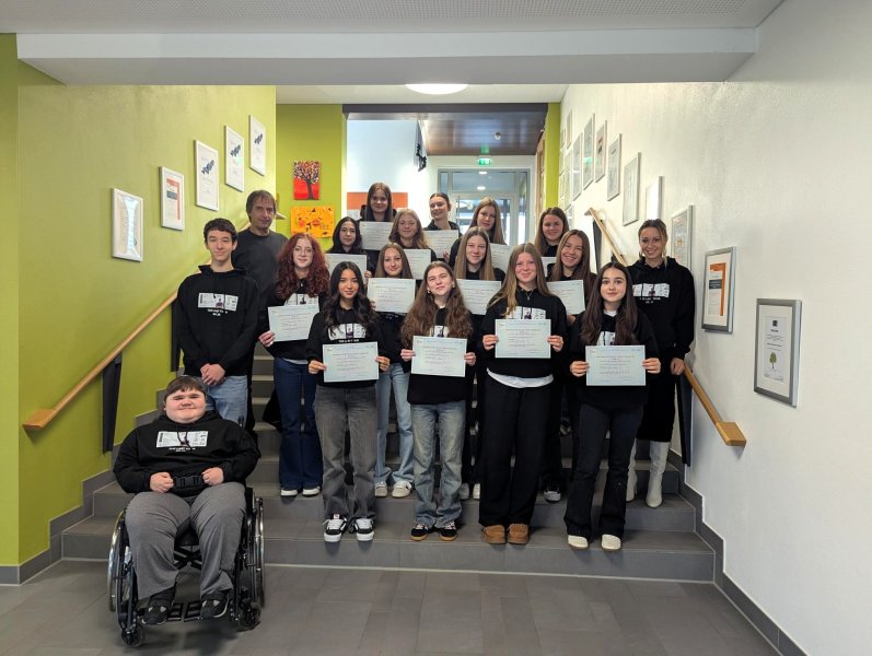 Stolz präsentieren die Schülerinnen und Schüler der Klasse 10c ihre DELF-Diplome! Das DELF (diplôme d'études en langue française) ist ein international anerkanntes Sprachzertifikat, das Fremdsprachenkenntnisse auf verschiedenen Niveaustufen bescheinigt. So hat die Französischklasse im letzten Schulj...