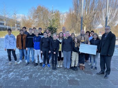 Mit Glühweinduft und Kerzenschein, Texten und Geschichten haben die Schüler und Schülerinnen des Café Tintenklecks an der Realschule Schöllnach gemeinsam mit den Lehrerinnen Claudia Lindner und Sabine Rauch die Schulfamilie auf die bevorstehende Weihnachtszeit eingestimmt. Stimmungsvolle musikalische Unterstützung bekamen sie vom Chor der 5. Klassen unter der Leitung von Mario Eckmüller und von der Saxophonistin Eva Loibl aus der 10. Klasse. Zahlreiche Gäste ließen sich im Schein der Feuerschalen am Pausenhof der Realschule Bratwurstsemmeln, Flammkuchen oder eine heiße Gulasch- bzw. Kürbissuppe schmecken. Wer wollte, konnte sich am Stand des FairTradeTeams mit kleinen Weihnachtsgeschenken eindecken. Nicht zuletzt durch die kostenlose Überlassung der Verkaufsbuden durch den Markt Hengersberg und die großzügige Unterstützung der Bayernwald KG Früchteverarbeitung, des Gasthauses Altenmarkter Hof und der Hofvermarktung Bernauer aus Vorading konnte ein beachtlicher Erlös erzielt werden. Mit Stolz und großer Freude durften die SchülerInnen einen Scheck in Höhe von 2.000,00 € an Herrn Wolfgang Geier und Herrn Ewald Straßer von der Lebenshilfe Deggendorf überreichen. Herzlichen Dank an alle Beteiligten!