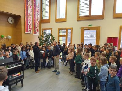 Kurz vor der Pause hieß es „absolute Ruhe“, als alle Schülerinnen und Schüler der Staatlichen Realschule Schöllnach in der Aula zu einer kleinen Überraschung für ihren Schulleiter, Herrn Graf, zum 50. Geburtstag zusammenkamen. Als er dann hereingeführt wurde, sangen die Klassen 5a und 5b unter der Federführung von Frau Faigl (die an dem selben Tag Geburtstag hatte) ein eigens gedichtetes Lied für ihn. Hier nur ein kleiner Auszug: