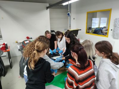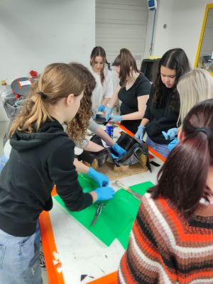 Die Betriebsbesichtigung begann mit einer herzlichen Begrüßung durch die Personalreferentin der Firma Wethje - Veronika Punzmann. Die Schülerinnen und Schüler wurden in drei Gruppen aufgeteilt und von sachkundigen Mitarbeitern durch die verschiedenen Produktionsbereiche geführt. Dabei konnten sie die Herstellung von Glas- und Kohlefaser-Verbundteilen für die Automobil- und Luftfahrtindustrie hautnah miterleben und auch selbst erproben. Von der Materialzuschnittmaschine bis zur Endmontage verfolgten die Jugendlichen den gesamten Produktionsprozess.