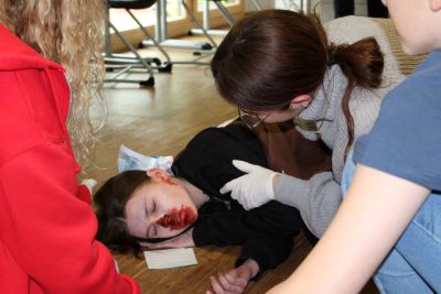 In diesem Jahr durfte die Staatliche Realschule Schöllnach den bereits 15. Leistungsvergleich der Schulsanitäter an niederbayerischen Realschulen ausrichten, nachdem ihr Team um Lehrerin Claudia Eder im letzten Jahr den Vergleich gewonnen hatte. Dabei betätigte sich die Siegermannschaft des Vorjahres als Helfer und mimte gekonnt die Verletzten und Erkrankten, denen die Teilnehmer dann in verschiedenen Stationen Erste Hilfe leisten mussten. Besonders freut Claudia Eder, selbst Erste Hilfe – Ausbilderin beim Roten Kreuz Deggendorf, dass mit Lisa Zitzlsberger und Samuel Eder zwei Sieger das Helferteam verstärkten, die bereits letztes Jahr ihren Abschluss an der Schule gemacht haben und nun extra ihren Urlaub opferten, um an diesem Tag als Juroren bei der „HLW mit AED-Station“ (Herz-Lungen-Wiederbelebung mit Defibrillator) dabei sein zu können. Beide waren nicht nur von der fünften bis zur zehnten Klasse begeistertes Mitglied im Schulsani-Team, sondern absolvieren beide aktuell eine Ausbildung zur Pflegefachkraft und engagieren sich nicht zuletzt wegen ihrer Erfahrungen als Schulsanitäter in ihrer Freizeit weiterhin ehrenamtlich als First Responder bei der Feuerwehr Riggerding. Zusätzlich werden sie beim Rettungsdienst Stadler gerade auch zum Rettungssanitäter ausgebildet. Auch die ehemalige Schulsanitäterin Marina Früchtl, die bereits vor neun Jahren die Schule abgeschlossen hat, ist bis heute beim Roten Kreuz Hengersberg aktiv und ließ es sich nicht nehmen, Claudia Eder und die Schulsanis mit ihren täuschend echt geschminkten Wunden zu unterstützen.