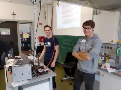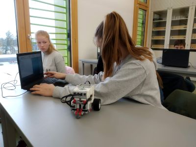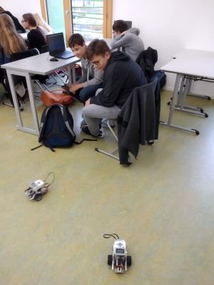 Mit Laptops und programmierbaren Robotern im Gepäck besuchten Vertreter der Technischen Hochschule Deggendorf am 13.11.2019 die Klassen 9 a und 9 d. Nach einem Überblick zum Thema "Informatik und Robotik im Alltag" ging es dann auch gleich ans Programmieren. Die Schülerinnen und Schüler durften dabei eigene textbasierte Programme umsetzen und diese an den Robotern anhand praktischer Aufgaben ausprobieren. Es galt dabei zum Beispiel einen motorisierten Roboter davon abzuhalten gegen Hindernisse zu fahren indem geeignete Ausweichmanöver automatisiert ausgelöst wurden.